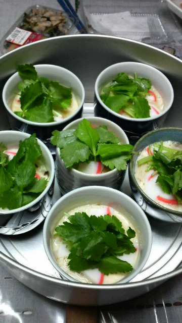 夜は茶碗蒸し作りました。いつも表面にスが出来るので、布巾を一枚使いました。