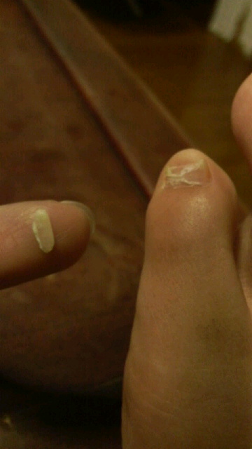 写メは汚いですが私の足。爪が割れてるの見えますか?指にのせてるのは調理中に
